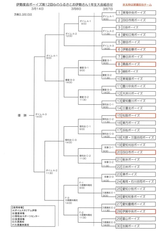 | 第12回日本少年野球心のふるさとお伊勢さん1年生大会 | 3/7(土)・3/8(日)・3/14(土) | 3/15(日) | ダイムスタジアム伊勢、他 |