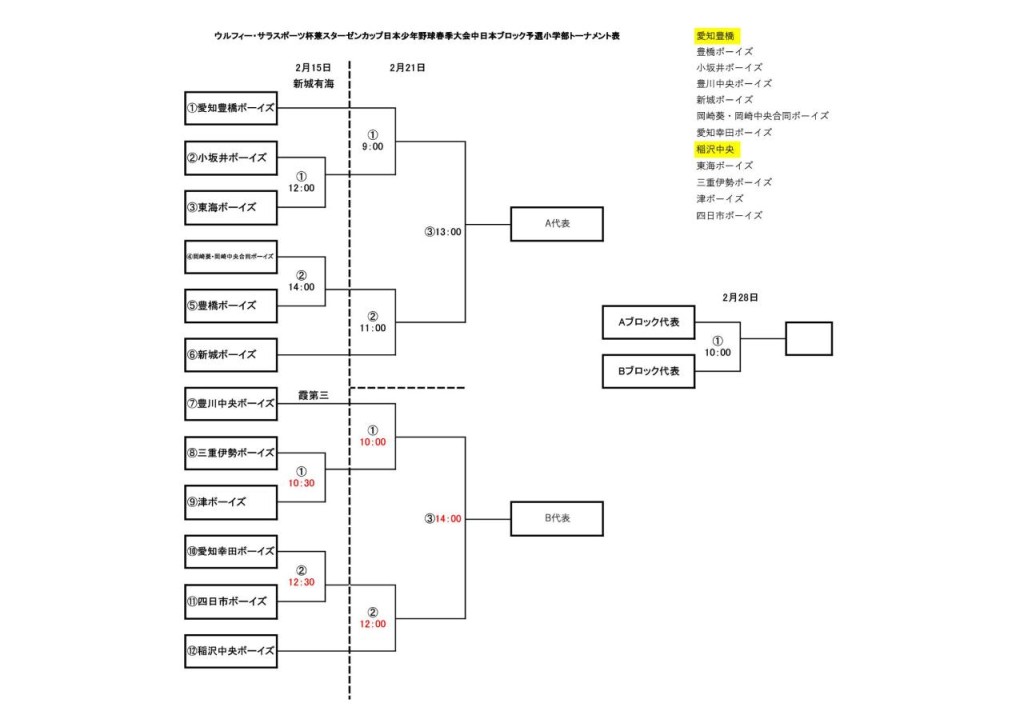 | ウルフィキャラバン・サラスポーツ杯兼スターゼンカップ日本少年野球春季大会中日本ブロック予選抽選会(小学生の部) | 1/24(土) | 開催地:リモートにて開催